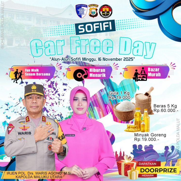 AKSESNEWS.COM, SOFIFI – Kepolisian Daerah Maluku Utara, melalui Direktorat Lalu Lintas bersinergi dengan Pemerintah Provinsi (Pemprov) Maluku Utara akan menggelar Car Free Day (CFD) perdana di Alun-alun Sofifi. Acara yang terbuka untuk umum ini akan dilaksanakan pada Minggu, 16 November 2025.